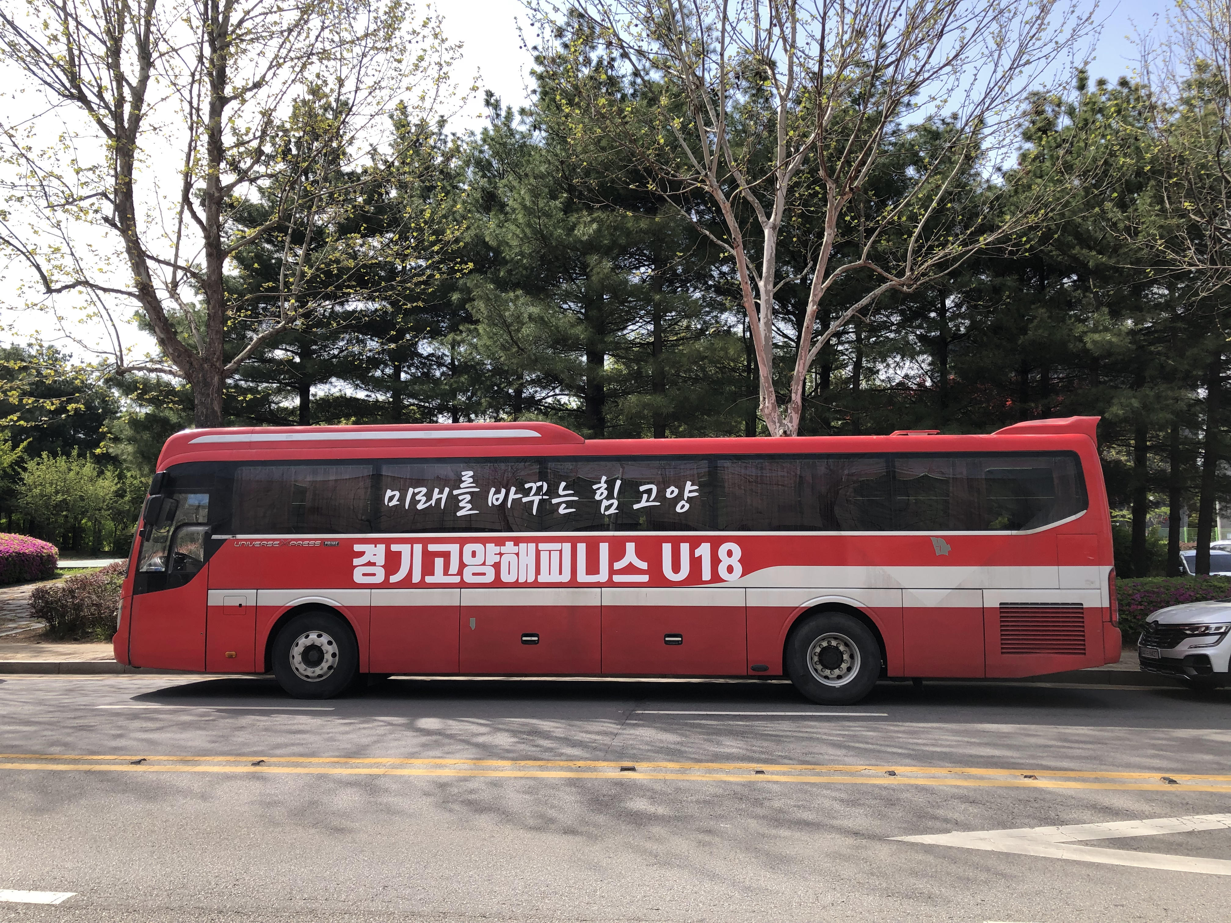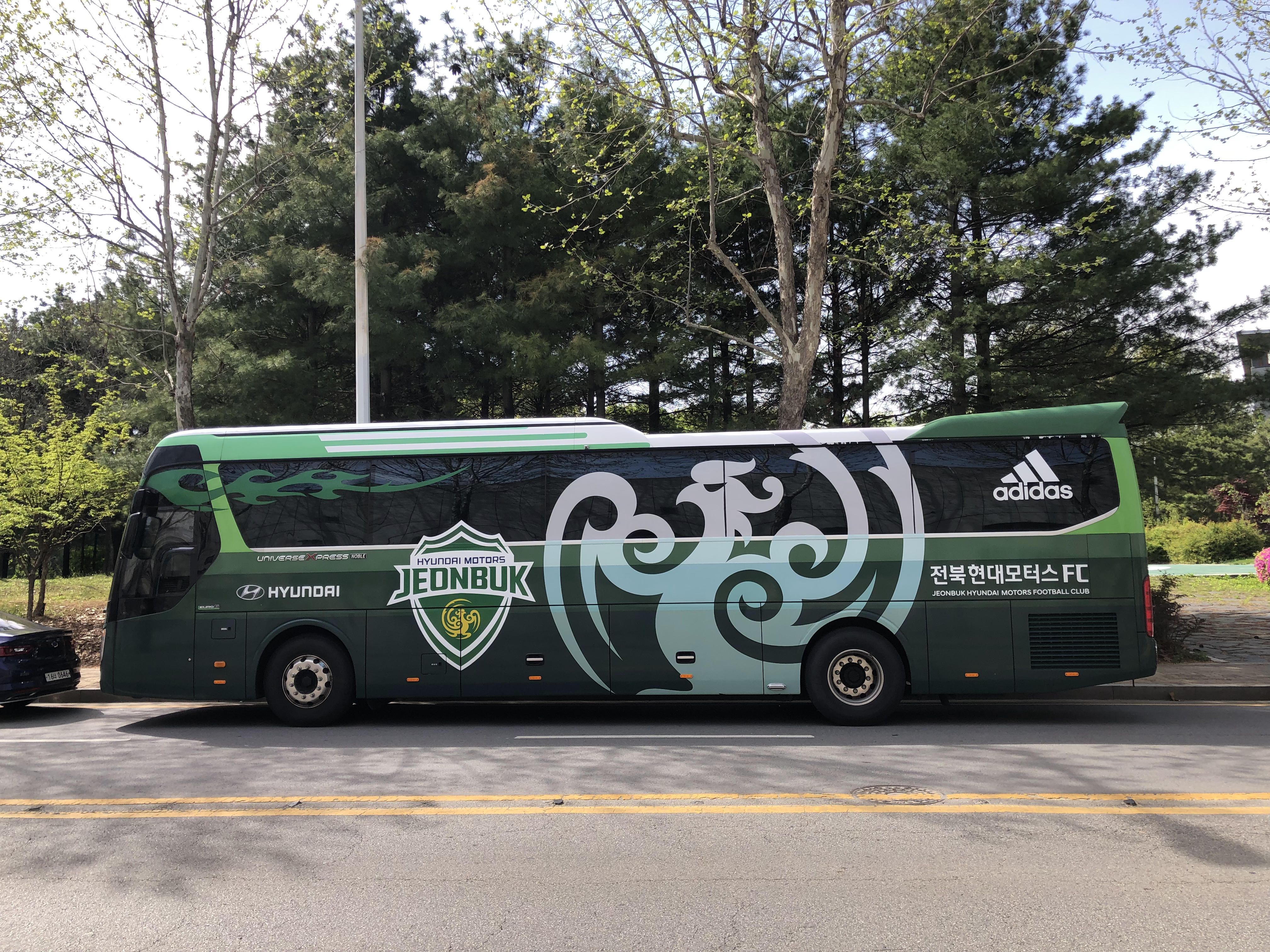 경기장 뒤쪽 길가에, 오늘 치열한 경기를 펼칠 선수단 버스가 보이네요. 무척 기대됩니다~